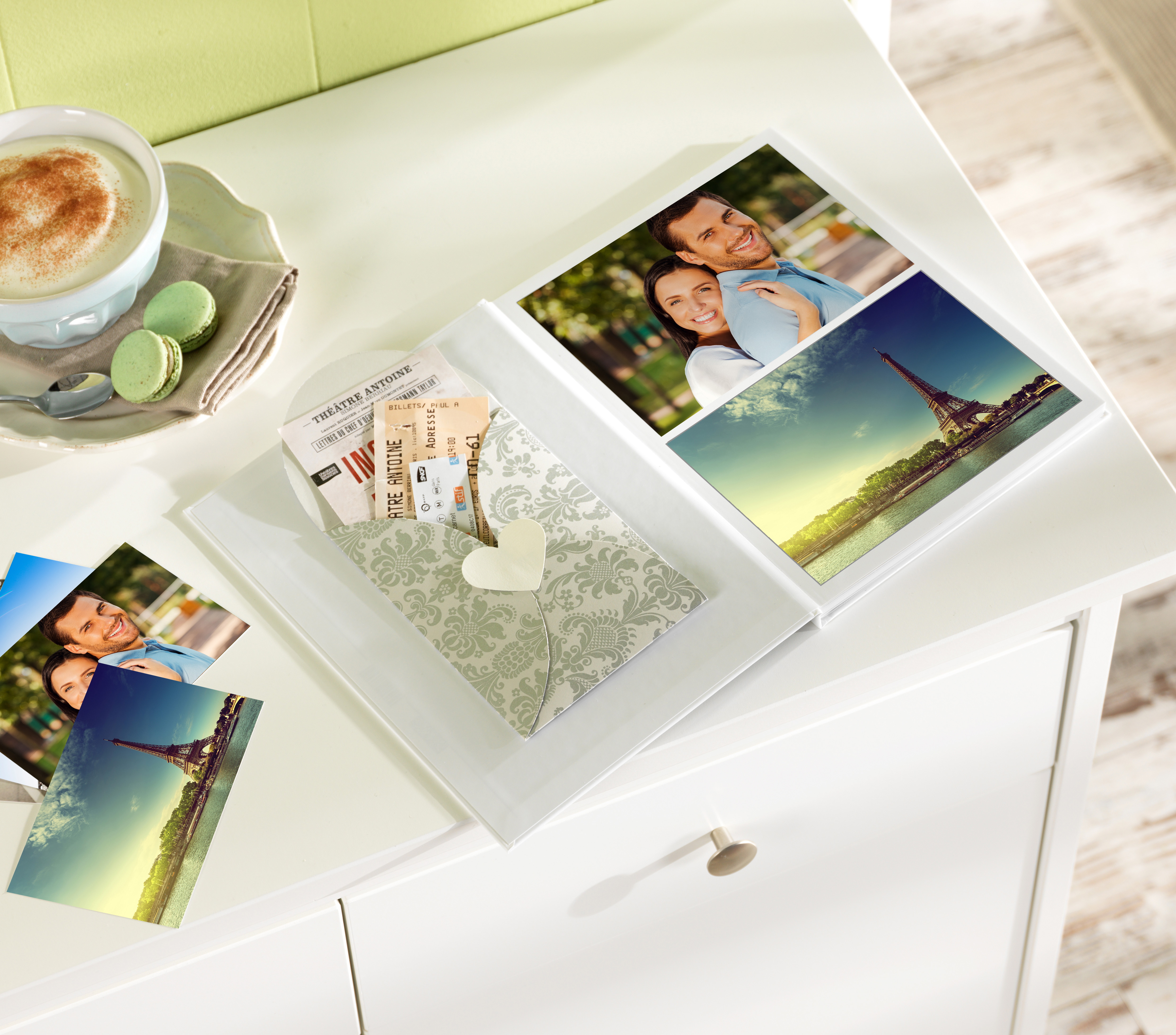 Verfraai de cover van je vakantiealbum met gouden, zilveren of kleurrijke lakopdruk.